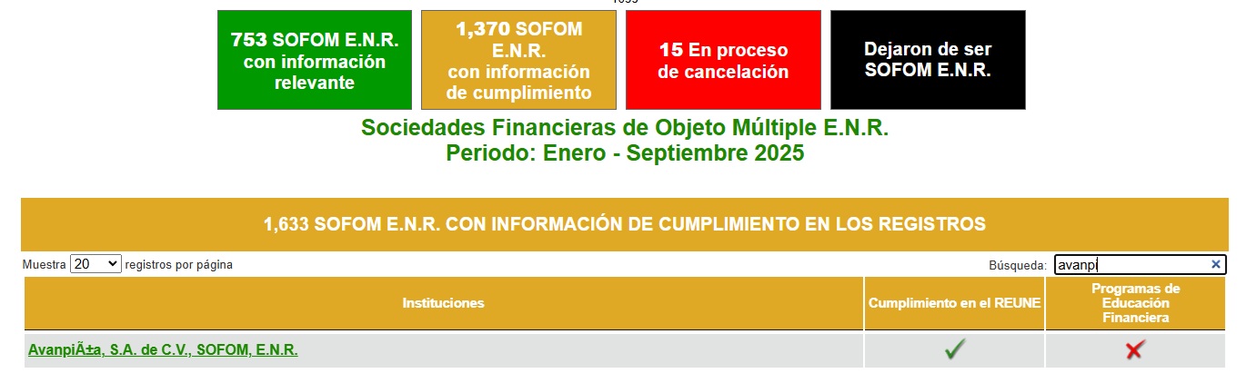 Información Específica de Avanpiña S.A. de C.V. SOFOM ENR, en el Buró de Entidades Financieras