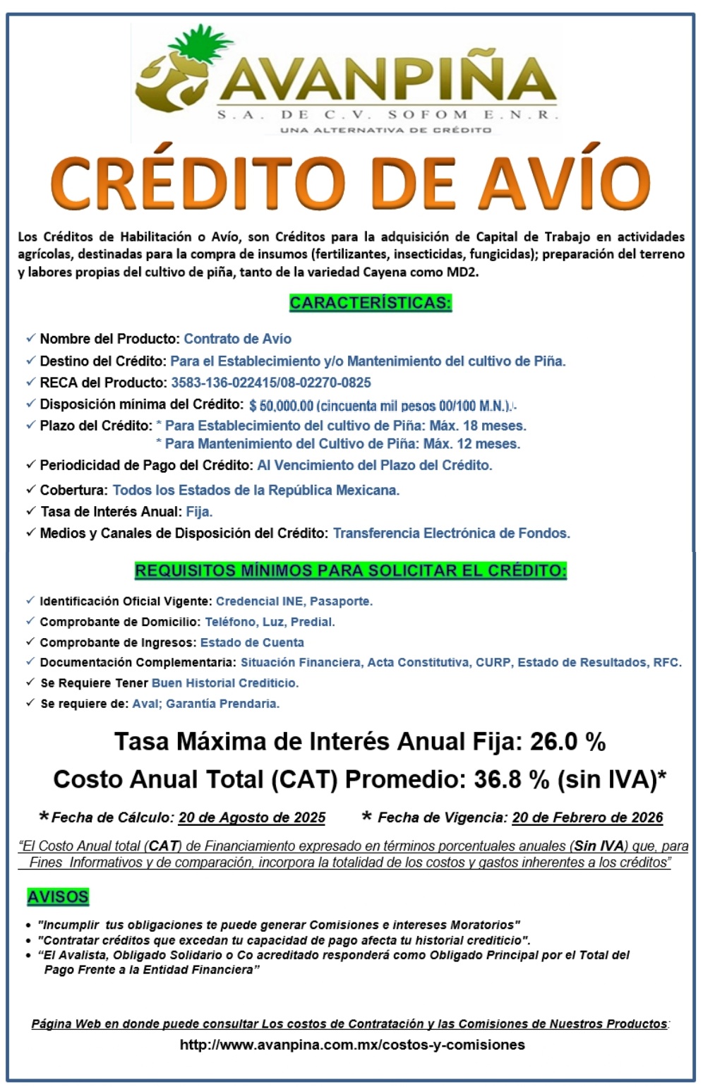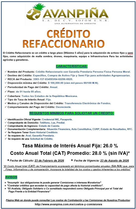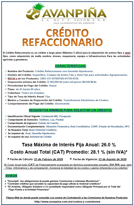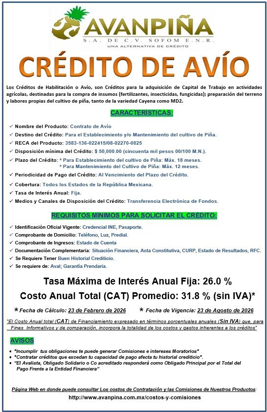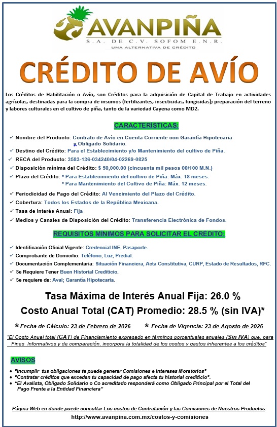 Avanpiña S.A. de C.V. SOFOM ENR, pone a su disposición los siguientes Productos y Servicios. Para ver los costos y Comisiones de dichos productos, por favor, de un "click" aqui :