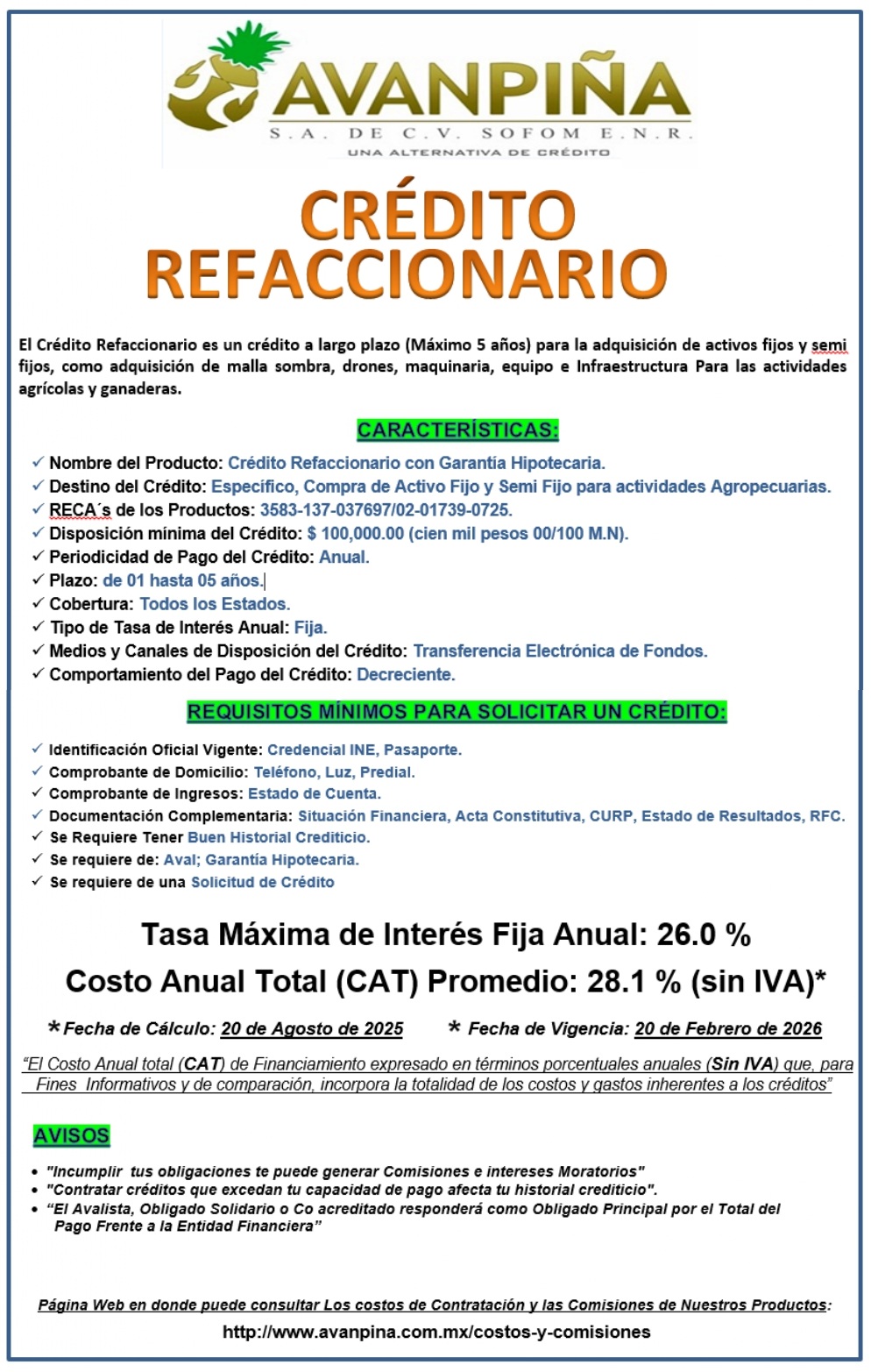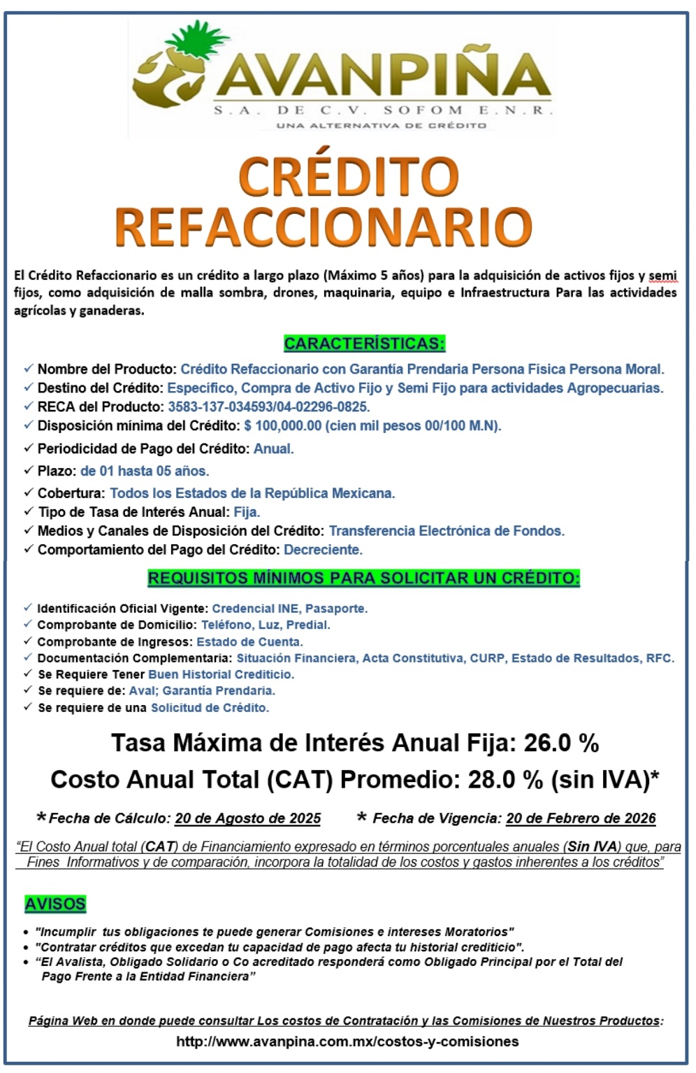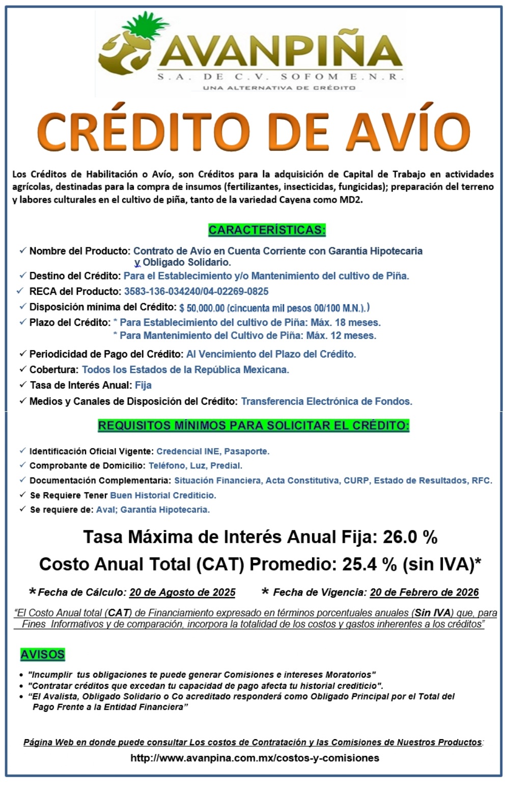 Avanpiña S.A. de C.V. SOFOM ENR, pone a su disposición los siguientes Productos y Servicios. Para ver los costos y Comisiones de dichos productos, por favor, de un "click" aqui :